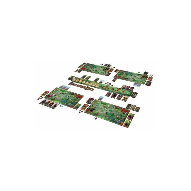 112 Trabajadores, 12 Marcadores de Atributo, 32 Talleres, 28 Monjes, 28 Puestos Avanzados, 28 Vasijas, 1 Manual Ilustrado, 4 Tableros de Jugador, 2 Tableros Principales, 1 Marcador de Jugador Inicial, 1 Marcador de Recursos, 40 Provisiones, 50 Plata y 245 Cartas.