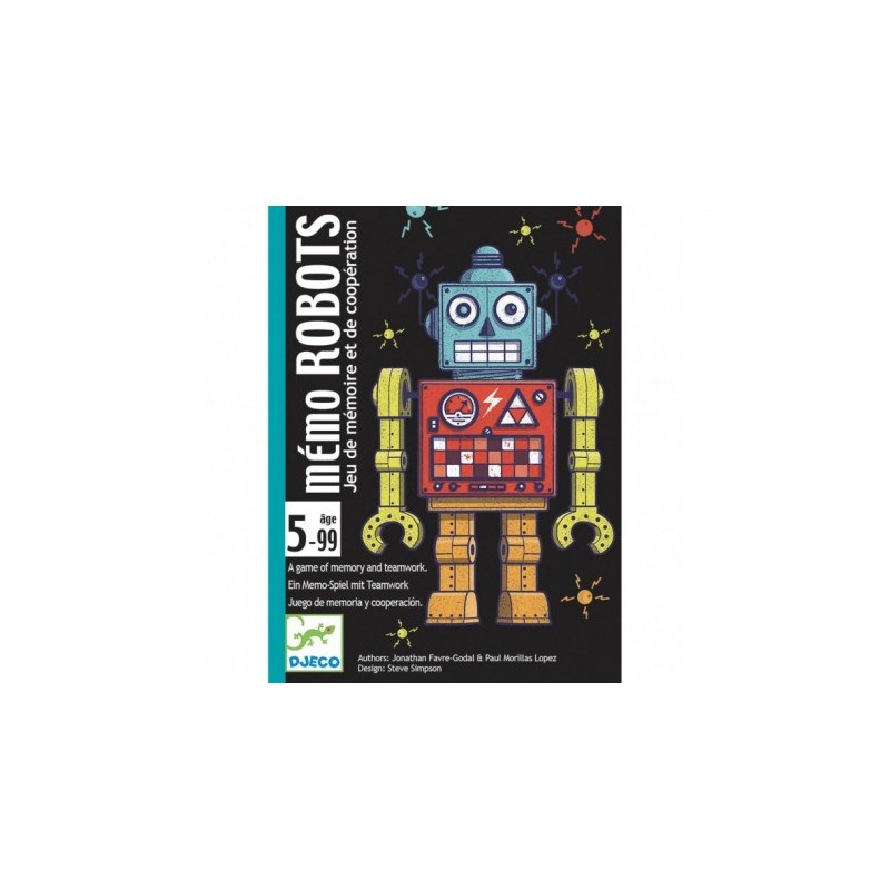 Memo Robots es un juego de memoria y cooperación, para jugar en solitario o acompañado. Harán falta memoria y cooperación para conseguir las cartas del robot «bueno». Al más mínimo error, el robot «malo» nos la jugará.