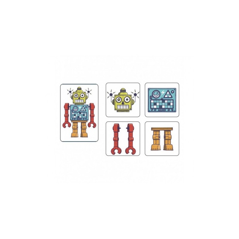 Entre todos, y usando vuestra memoria, tendréis que construir al robot “bueno” antes que al robot “malo”. Cada turno, robáis una carta y entre todos tendréis que poneros de acuerdo para decidir que 4 cartas se levantarán para dar forma al mismo robot. Si son las cartas necesarias ¡habréis ganado! Pero si no son las correctas ¡mala suerte!