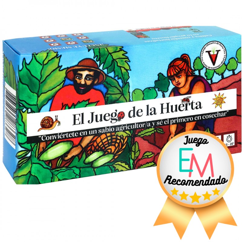 El juego de la huerta consta de 72 cartas, 80 tarjetas y 6 huertos, está recomendado para 2-6 jugadores a partir de 6 años y además incluye otro juego, un memo de hortalizas para ejercitar la memoria con las hortalizas de la huerta.