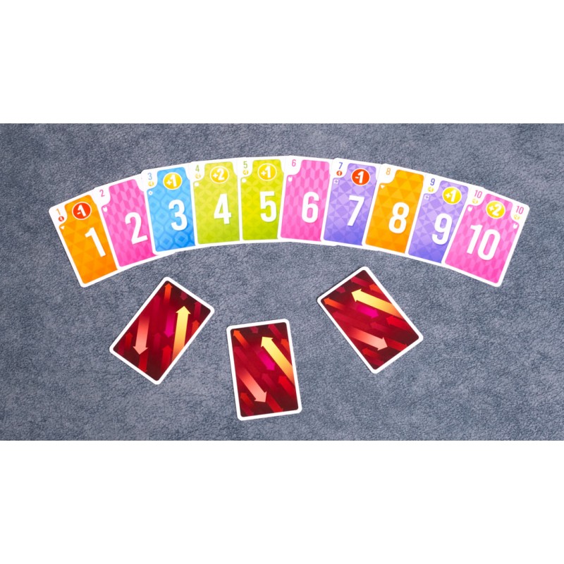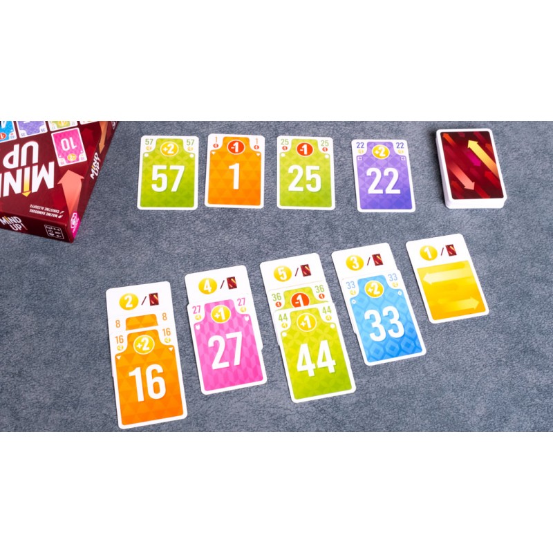 En Mind Up comenzaréis la partida con una fila de cartas sobre la mesa, tantas como participantes. En cada turno, tendréis que elegir una carta de vuestra mano y, simultáneamente, revelarla para formar una nueva línea, ordenada de la carta más baja a la más alta. Luego, cada participante toma la carta de la línea anterior en la misma posición que la que acaba de jugar y la agrega a su zona de juego. Aquí tendrás que pensar muy bien donde la colocas porque estas cartas sumarán puntos al final de la ronda, dependiendo de su color y del orden en que fueron elegidas. Después de ser puntuadas, pasaran a tu mano para la siguiente ronda.