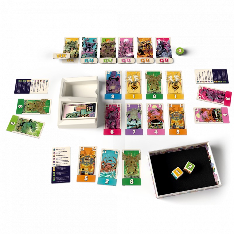Tira los dados para invocar a Kaijū(1) o Mecha(2) y tomar las cartas que los representan.