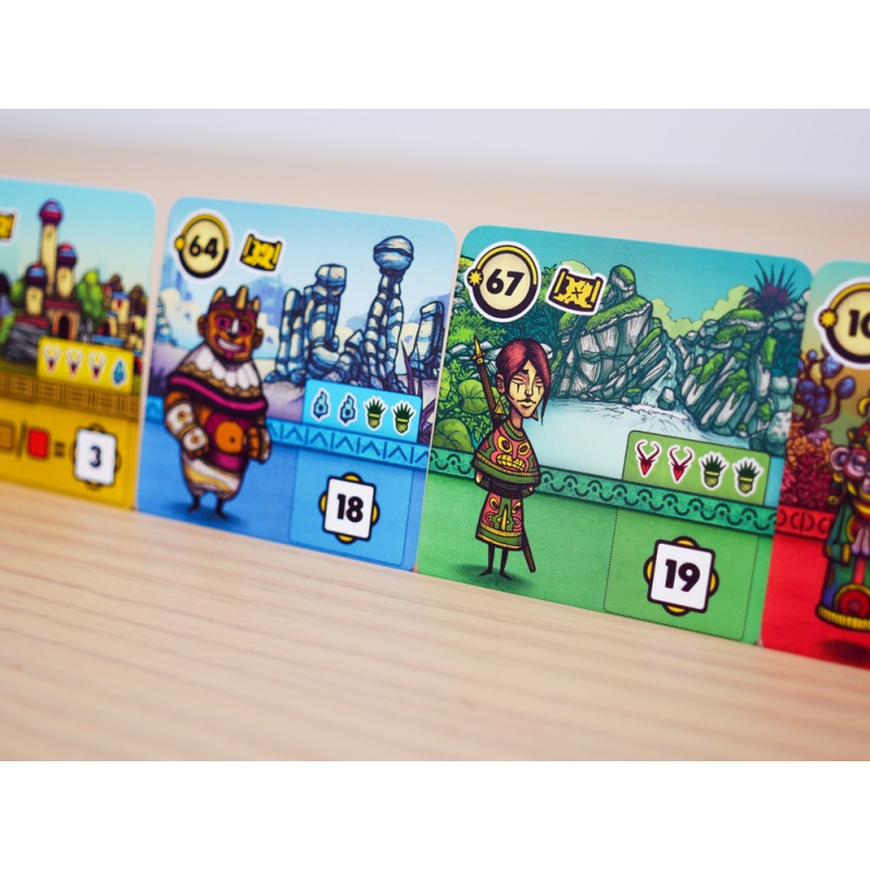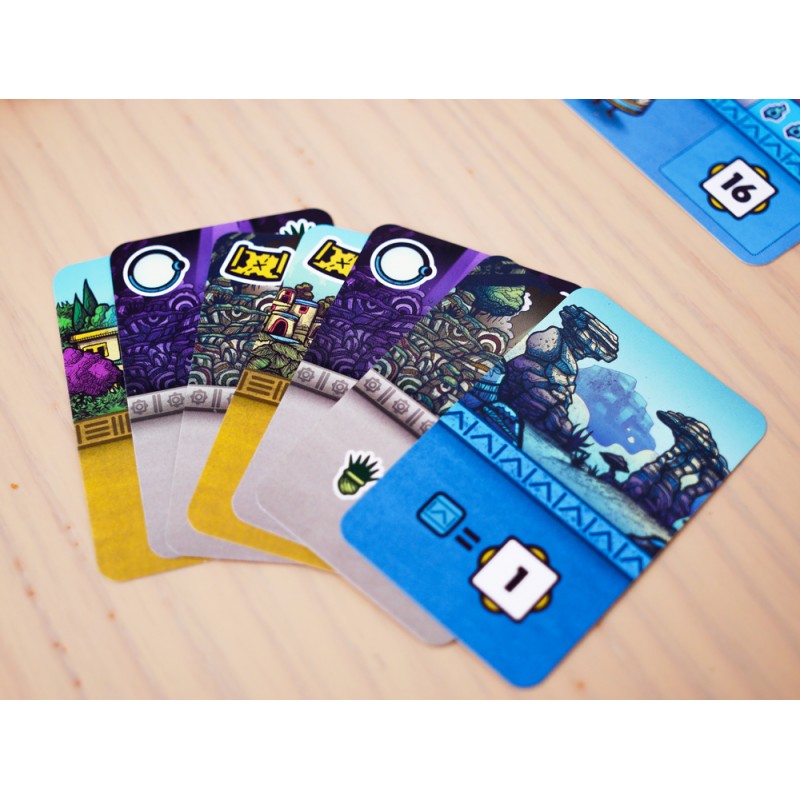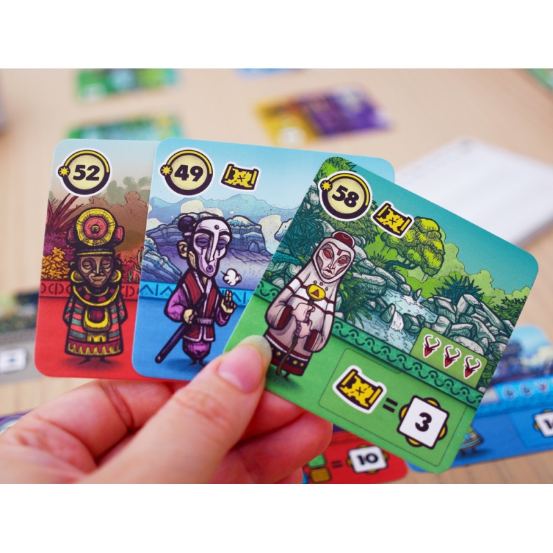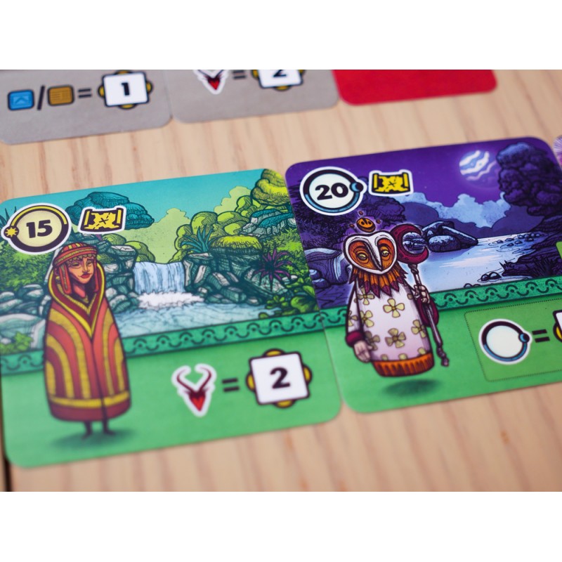 En cada turno, juegas una carta de una mano de 3. Luego eliges una nueva carta de un río boca arriba. Como el juego es simultáneo en Faraway, debes tener en cuenta un inteligente sistema de prioridades en todas tus elecciones: ser el último en elegir una carta te deja con menos opciones y, a menudo, con opciones menos rentables para los siguientes turnos.