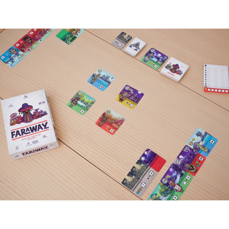 Faraway es un juego de cartas que te descubrirá un nuevo continente. Cruza su mundo cambiante y descubre las maravillas que esconde. Conoce a sus habitantes, revela sus secretos y obtén más fama que tus oponentes. Planifica bien tu viaje, ya que, al final de la partida, contarás tus puntos de atrás adelante, ¡empezando por la última carta que has jugado!