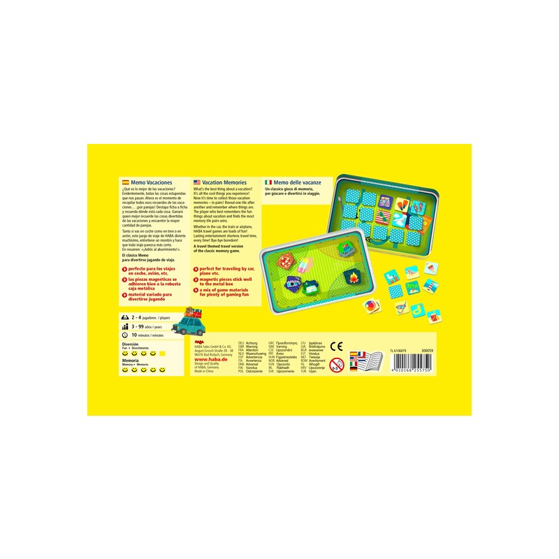 Ha llegado el momento de recopilar recuerdos de las vacaciones… ¡por parejas! Los jugadores voltean ficha a ficha y recuerdan dónde está cada cosa. Ganará quien mejor recuerde las cosas divertidas de las vacaciones y encuentre la mayor cantidad de parejas.