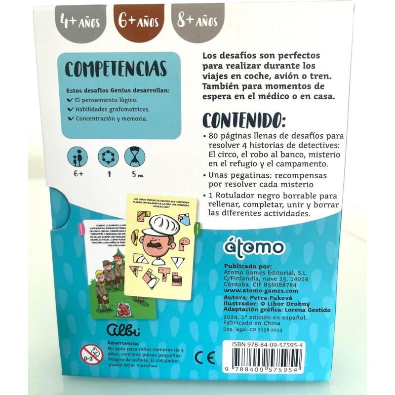 80 páginas llenas de desafíos para resolver 4 historias de detectives: el circo, el robo al banco, misterio en el refugio y el campamento. Además de, añadir 1 rotulador negro borrable como la versión +4 años, trae unas pegatinas como recompensa por resolver cada misterio.
