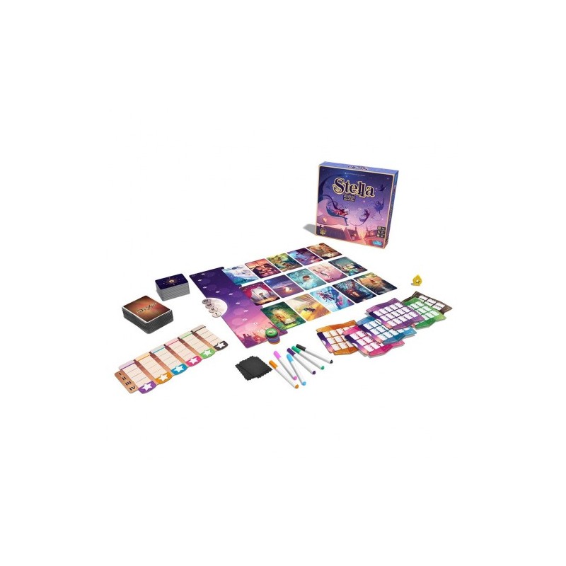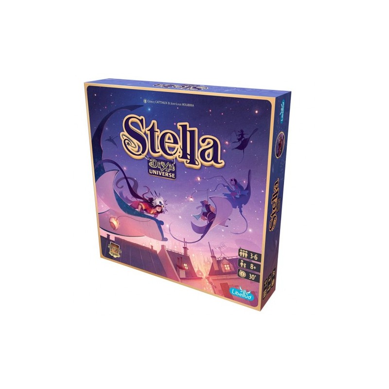 ¡Buscadores de estrellas! Explora el cielo y devuelve la luz a tu mundo. Stella es un juego competitivo en el cuál en cada ronda, los jugadores interpretarán las cartas Dixit en un tablero tras recibir una palabra de pista común. Cada jugador observa las cartas Dixit y asocia en secreto estas cartas con la palabra clave. Los jugadores indican en sus pizarras personales borrables las cartas Dixit que eligen.
