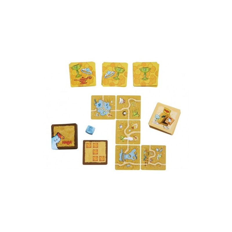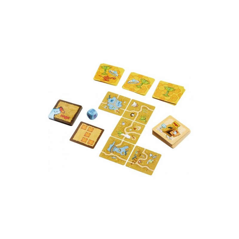 30 cartas de recorrido, 12 cartas de misión, 12 cartas de tesoro, 1 dado, 1 instrucciones del juego.