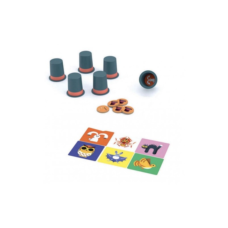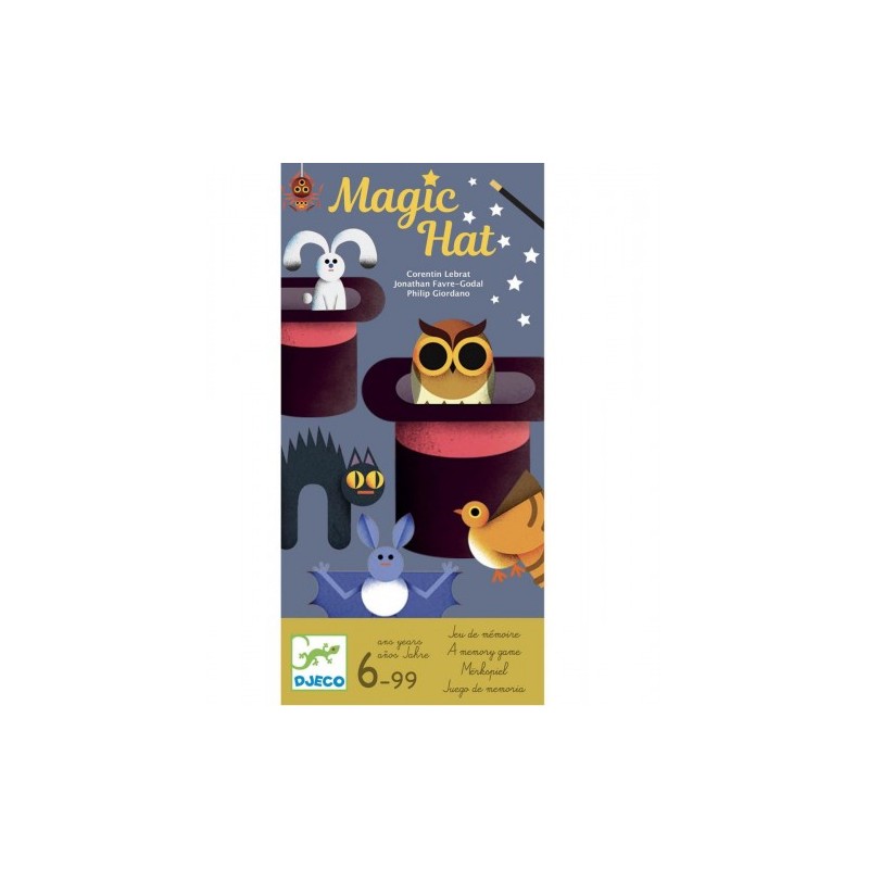 Magic Hat es un juego de mesa para niños en el que, durante un fascinante espectáculo de magia, el joven prestidigitador hace desaparecer uno de sus animales ¿Puedes averiguar cuál es? Para ello, basta con mirar la parte inferior de los sombreros restantes... ¿Fácil? No estoy tan seguro... ¡porque los sombreros se mueven!