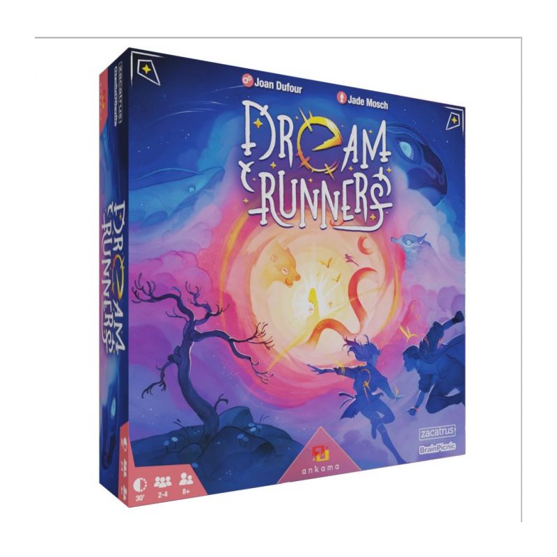 Dream Runners es un juego de mesa que nos sumerge de lleno en el mundo de los sueños. Últimamente estas teniendo sueños muy raros… búhos de cuatro alas, islas indómitas desconocidas, gente extraña a tu lado… ¡Tendrás que encontrar la manera de alejarte de estos malos sueños! ¡Busca el patrón, compra llaves y fragmentos estelares, y escapa de las pesadillas!