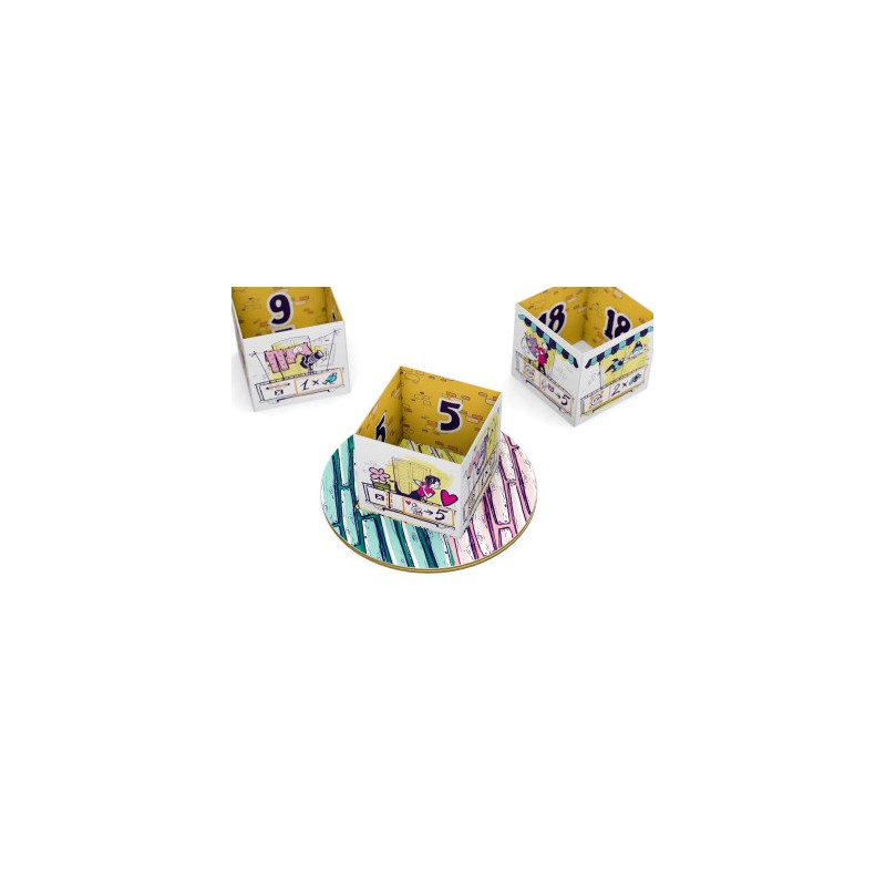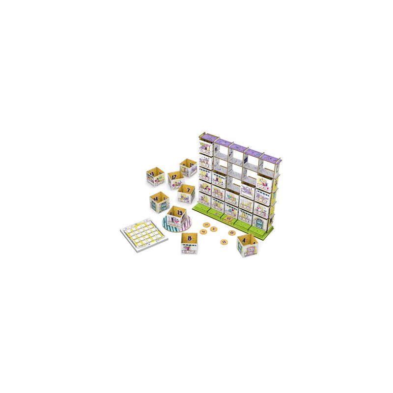 Construye un edificio de apartamentos, bloque a bloque, rellenando la cuadrícula de 5х5. En cada turno, uno de los participantes elegirá qué dos lados del bloque del edificio le tocarán y qué dos lados le dejará al contrincante. Sin embargo, es el otro participante quien decide dónde colocar el bloque de construcción. Intenta por todos los medios cumplir las condiciones de los balcones que tienes enfrente. ¿Quién ganará más puntos al final de la partida? Balconia es un juego táctico ligero para 2 participantes con componentes inusuales en 3D sobre la creación de armonía dentro de un mismo edificio.