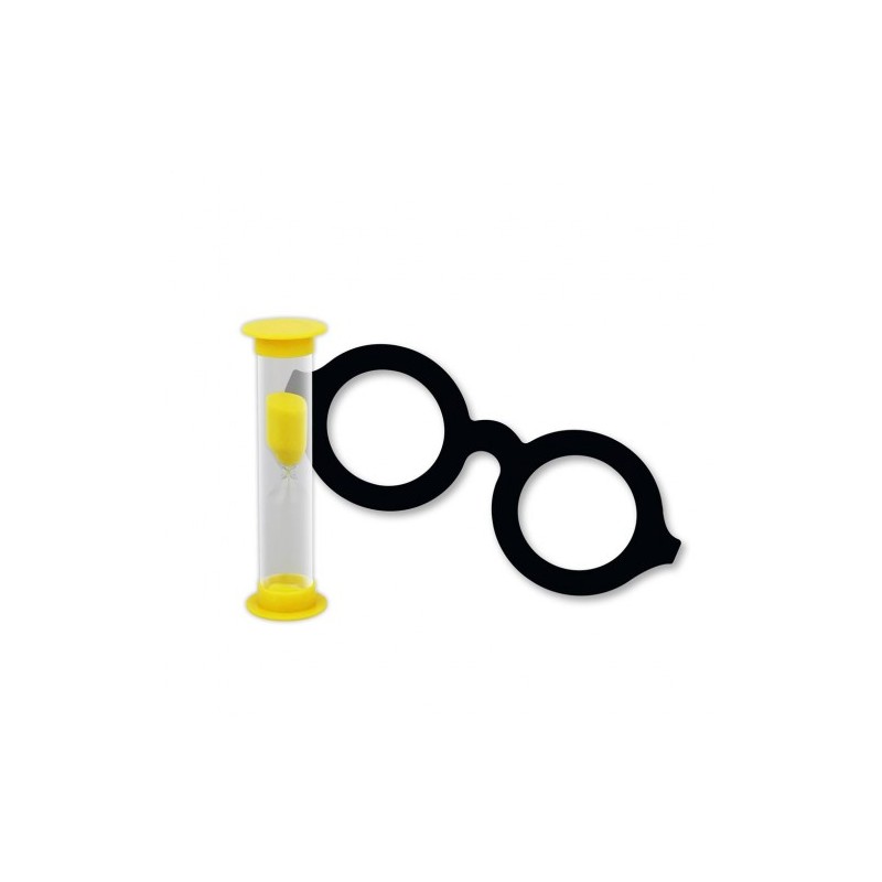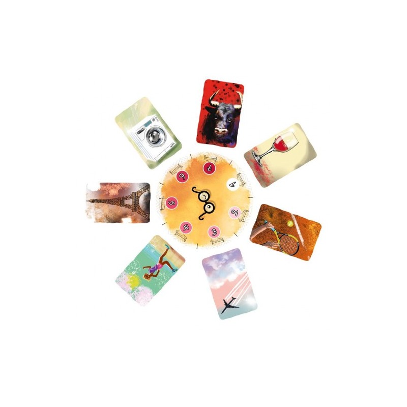 120 cartas, un tablero circular, un par de gafas y un reloj de arena.