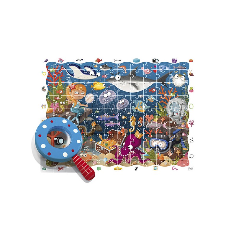 ¡Coge la lupa y encuentra todos los objetos! Este divertido puzzle de 108 piezas está lleno de detalles. Construye el puzzle, coge la lupa de madera y conviértete en detective buscando todos los objetos y animales que se muestran en el marco. ¡En el fondo marino podrás encontrar desde un cofre del tesoro hasta un despertador!